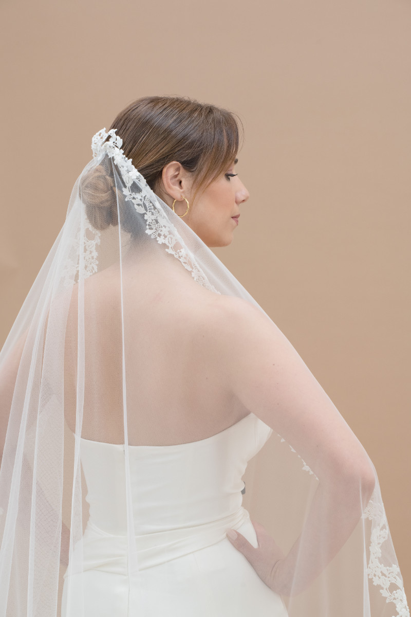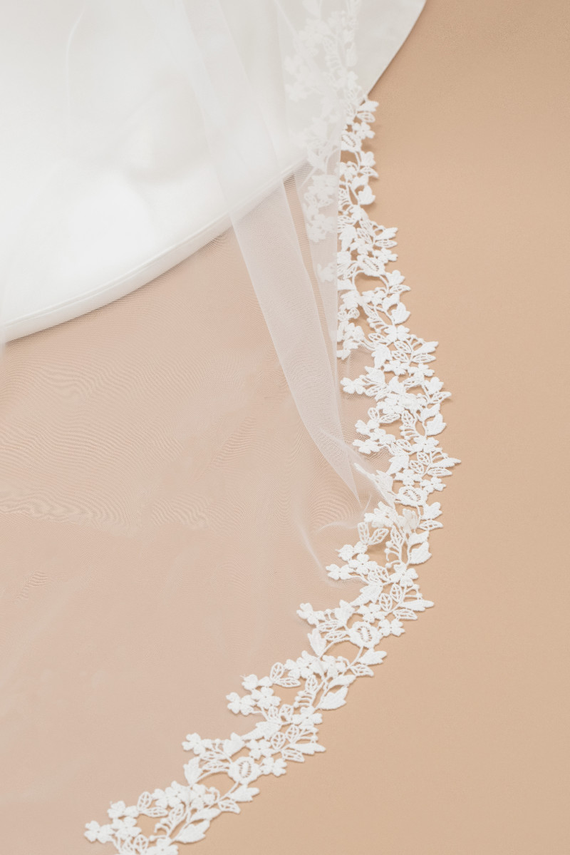 Chapel length veil in single tier soft tulle with 8cm width lace on the edges, all around. 2 meters length and 3 meters width.