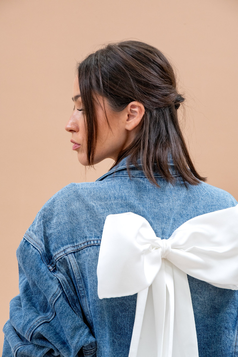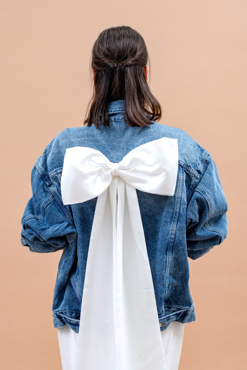 Denim Jacket with a light wash oversize cropped style with a satin bow on the back.