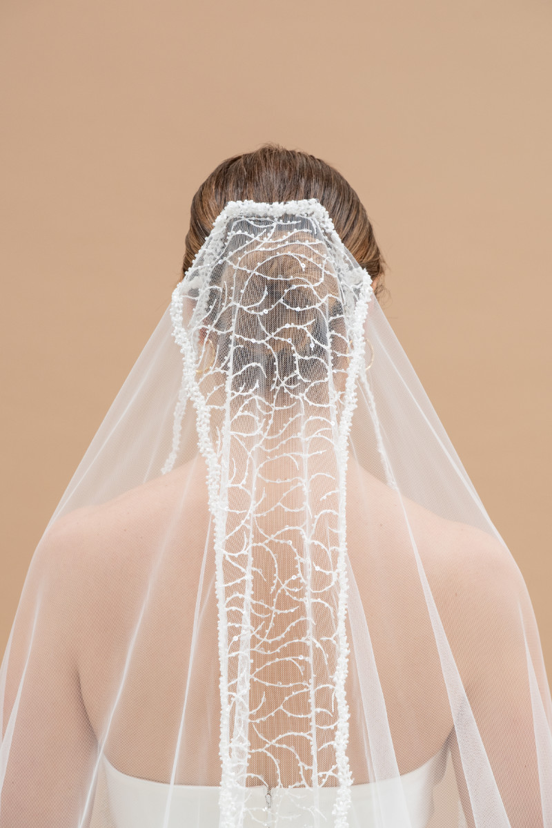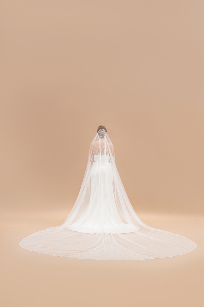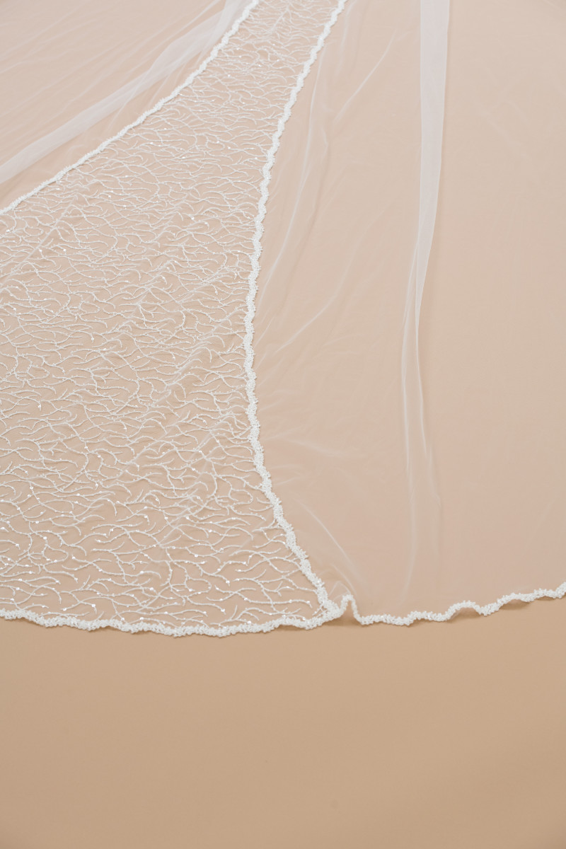 Cathedral length veil in single tier soft tulle with beaded edge and middle motif. The beaded draw in the center of the veil starts from the top (head) in a 10/15cm width and opens on the floor until the edge (1 meter width). 4 meters length and 3 meters width.