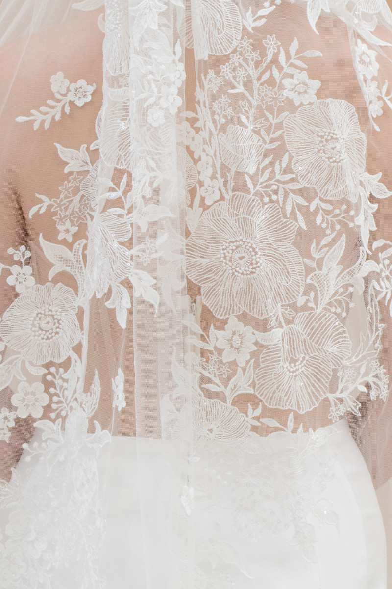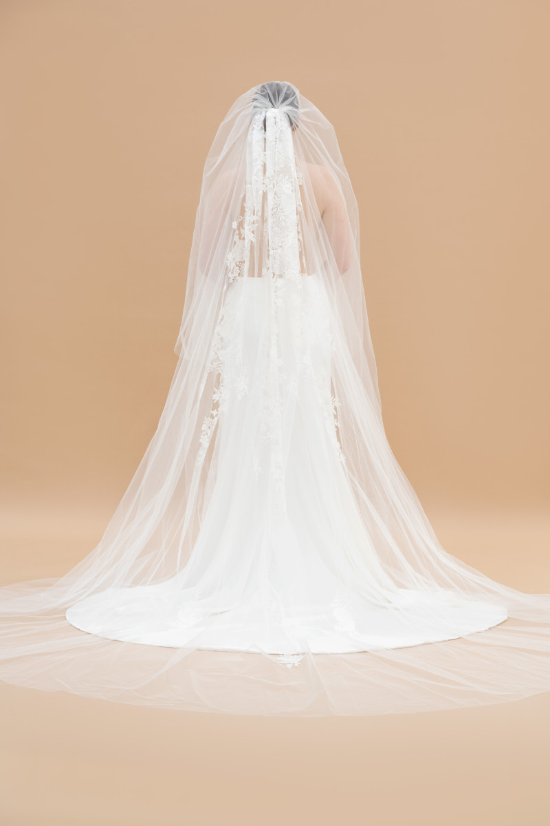 Cathedral length veil doble tiered in soft tulle with pattern lace on the back and scattered all over. 3 meters length and 3 meters width.
