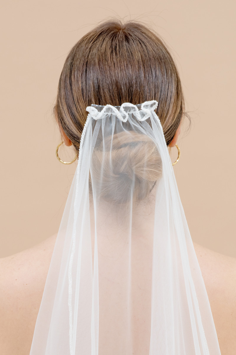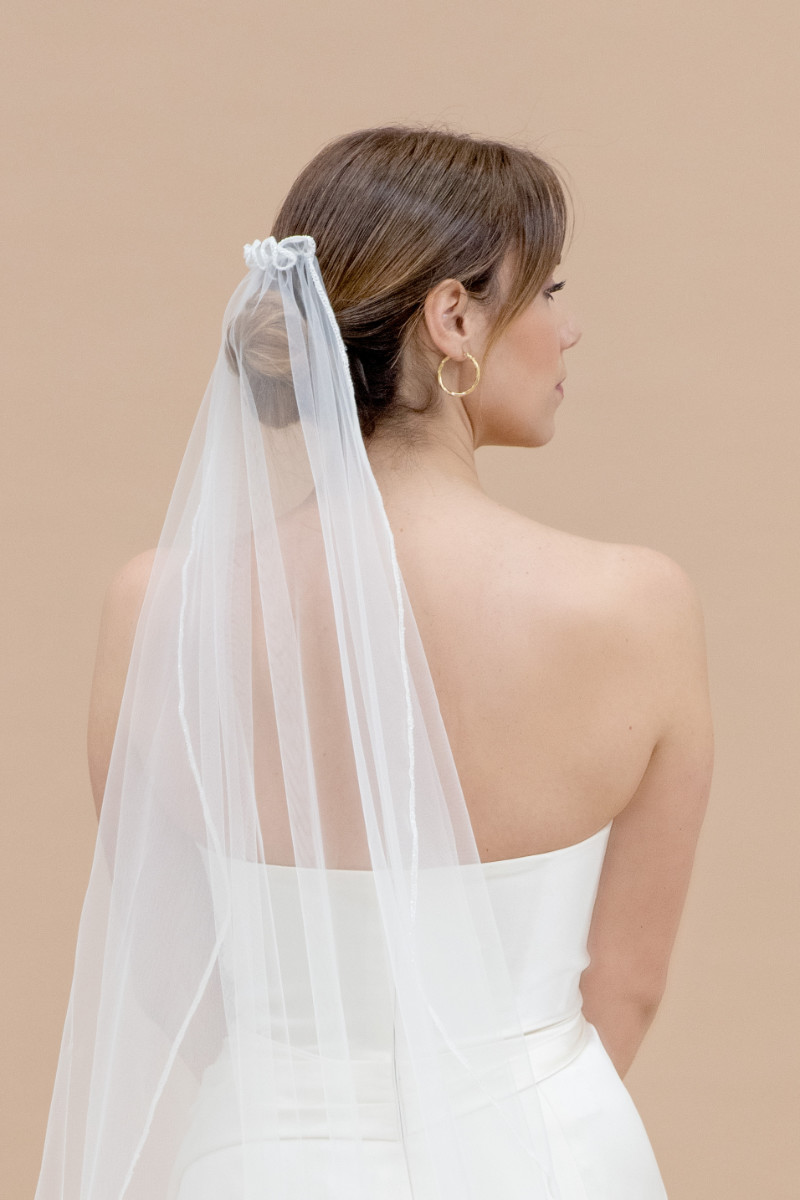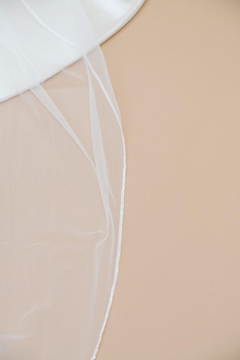 Chapel length veil single tiered in soft tulle with beaded edges and all around. Wavy effect over the comb. 2,5 meters length and 1,5 meters width.
