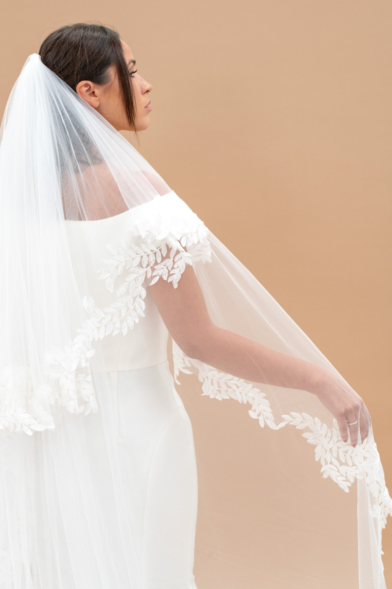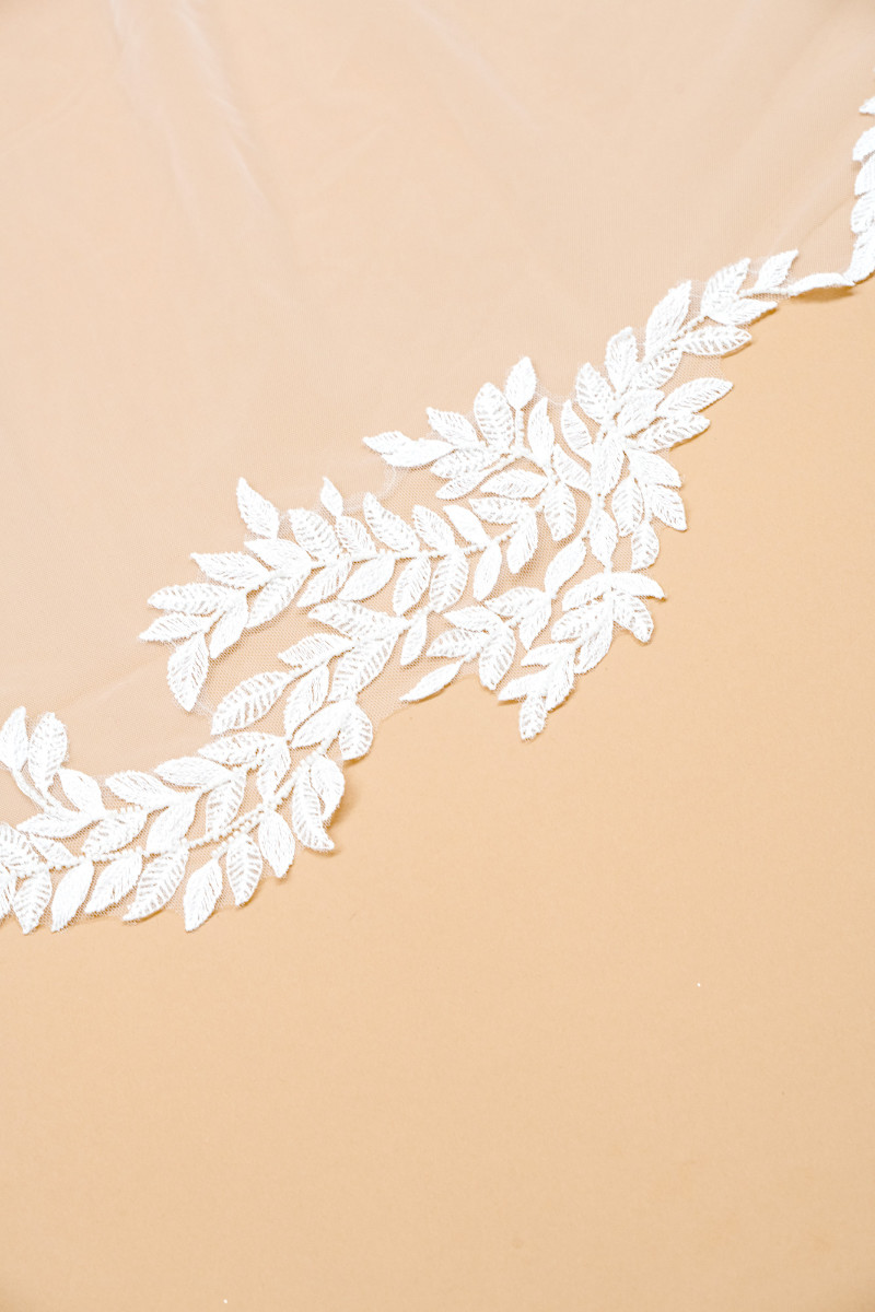 Cathedral length veil, single tiered, in soft tulle with ramifications in silk organza sewn with bronze thread and embellished with 3D nude leaves. 4 meters length and 3 meters width.